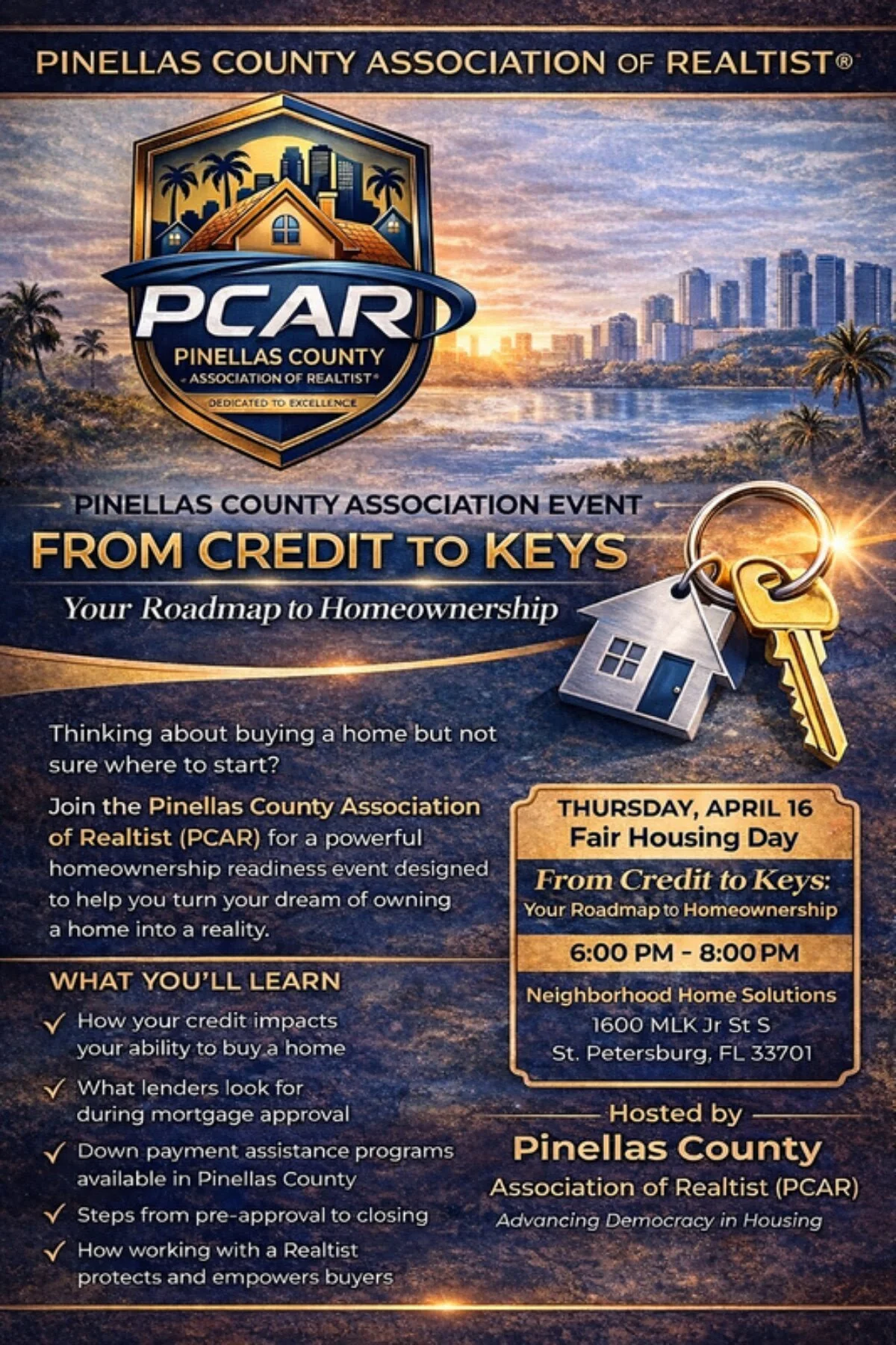 Join the Pinellas County Association of Realtists (PCAR) for From Credit to Keys: Your Roadmap to Homeownership, an empowering Fair Housing Day event designed to guide you through every step of the homebuying journey. Whether you're just starting to build your credit or preparing to purchase your first home, this session will connect you with trusted professionals who will break down what lenders look for, available down payment assistance programs, and how to move confidently from pre-approval to closing. Walk away informed, prepared, and one step closer to turning your dream of homeownership into reality.
